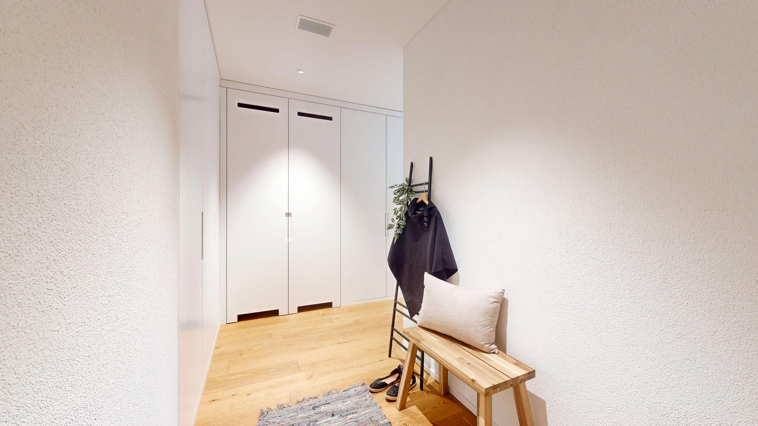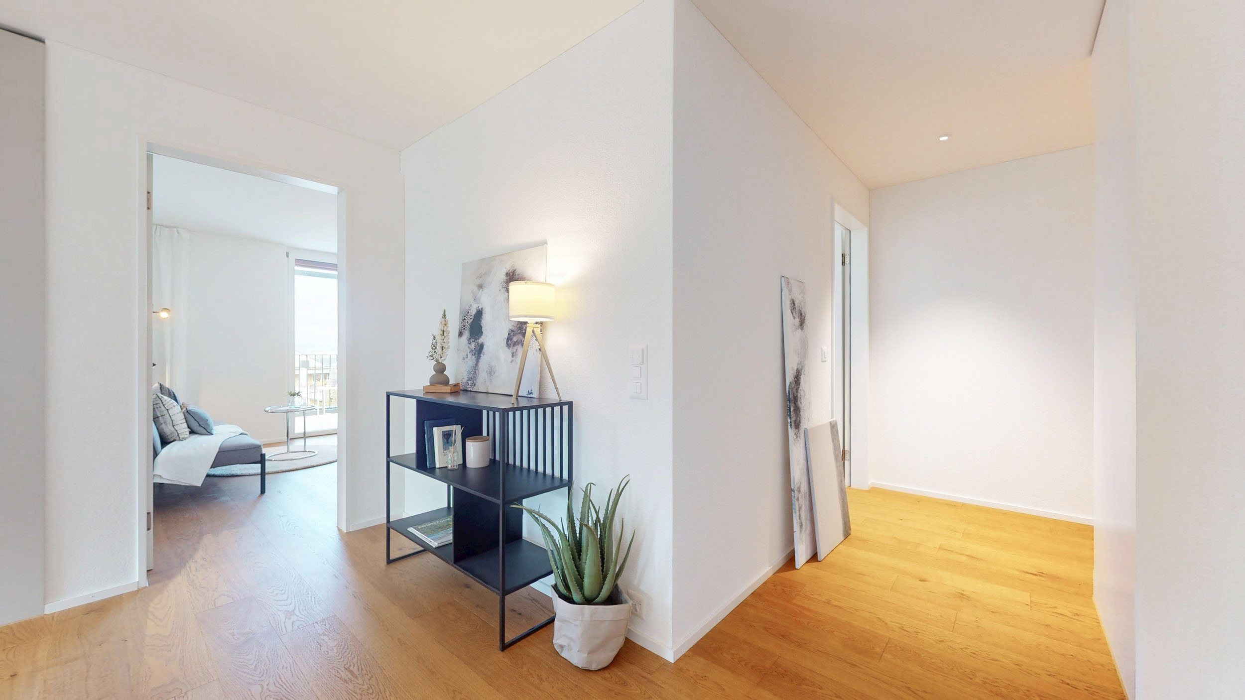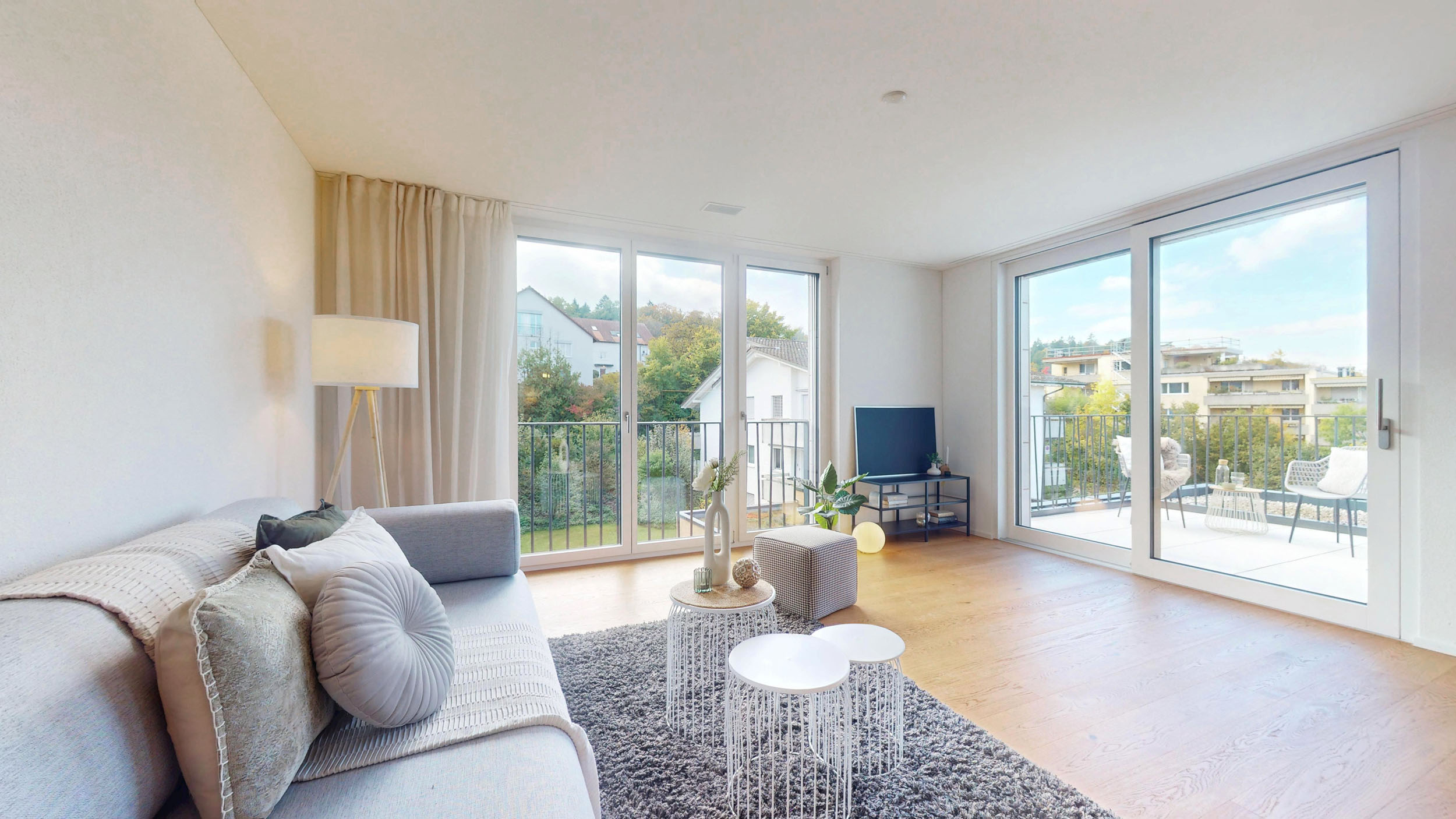 Der weiträumige Wohnbereich überzeugt mit grossformatigen Eichenparkettriemen und sorgt für Wohlbehagen. In den Nasszellen sind elegante, keramische Boden- und Wandplatten vorgesehen.