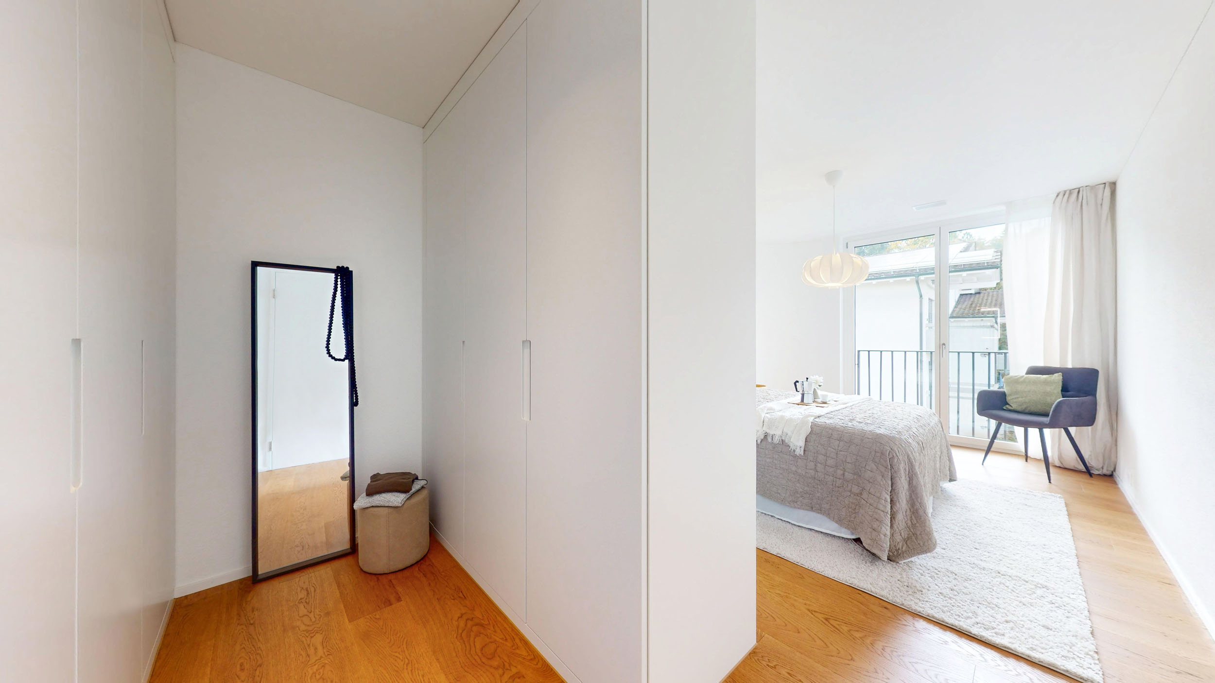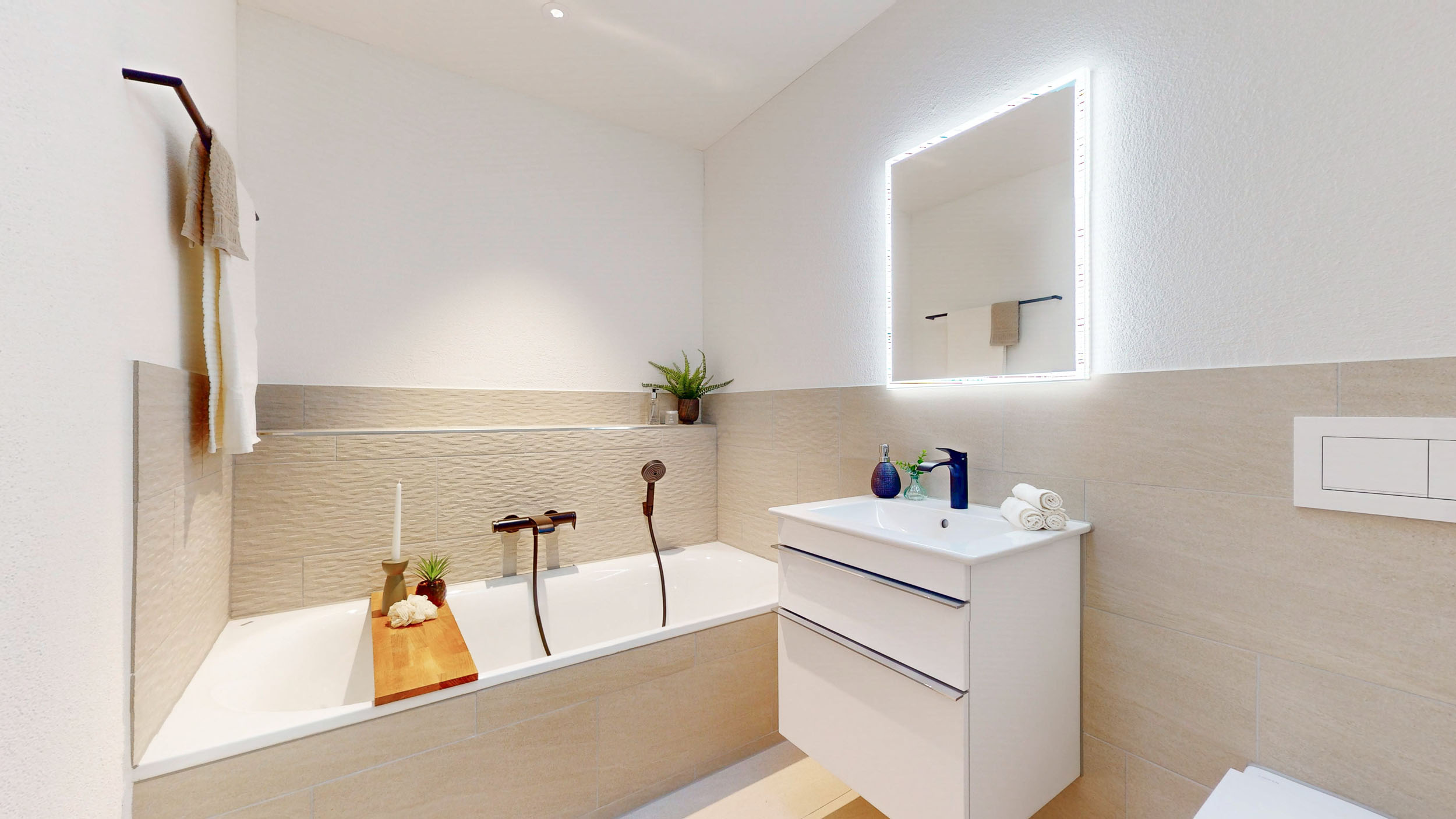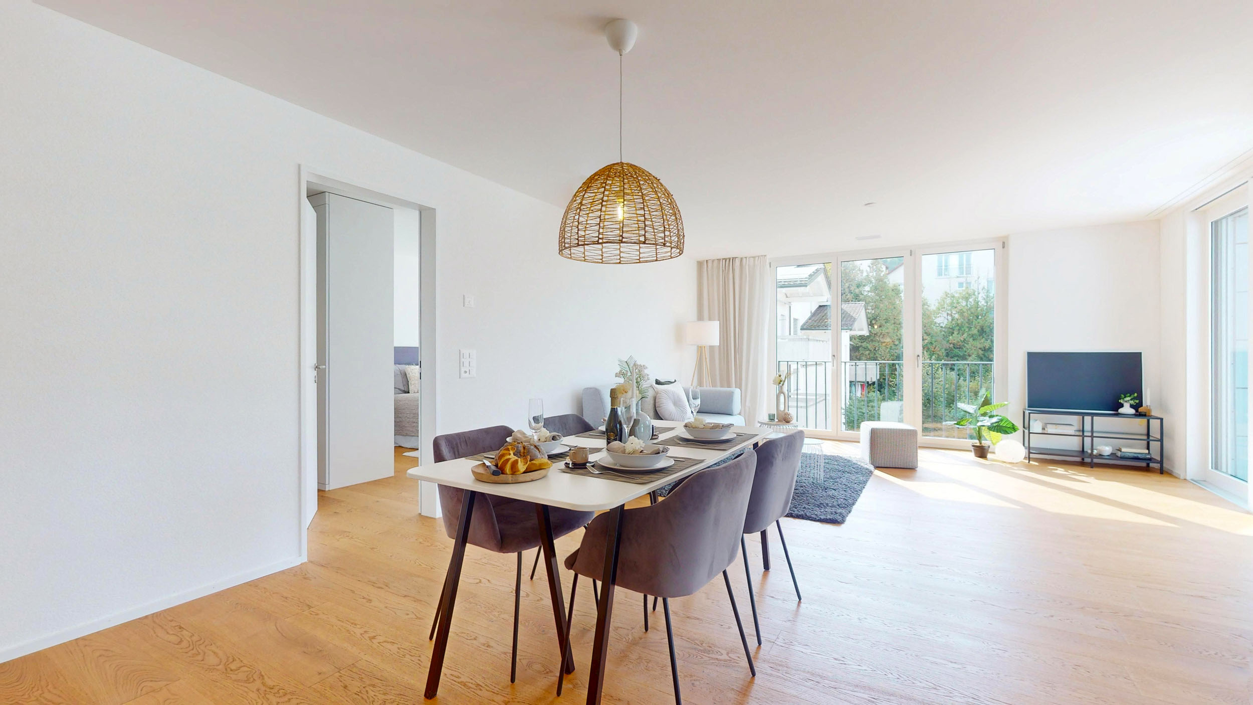 Der weiträumige Wohnbereich überzeugt mit grossformatigen Eichenparkettriemen und sorgt für Wohlbehagen. In den Nasszellen sind elegante, keramische Boden- und Wandplatten vorgesehen.